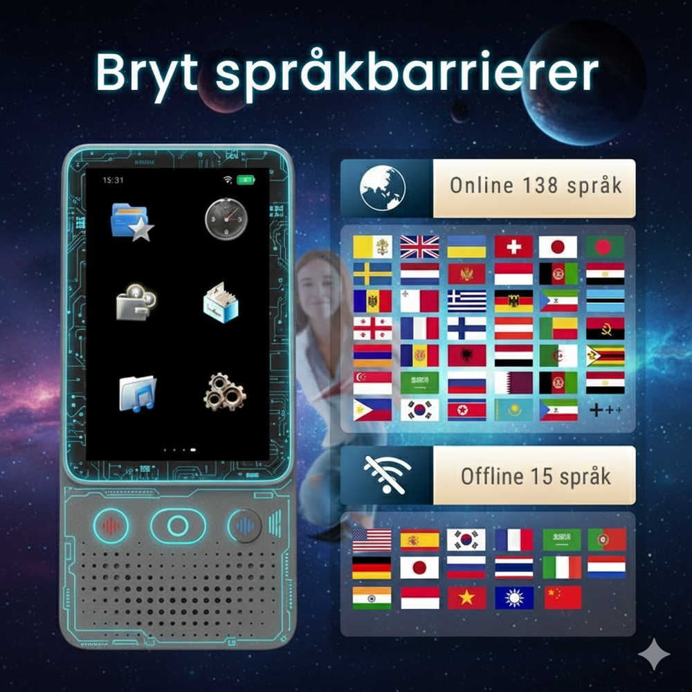 Enheten støtter opptil 138 språk, inkludert tale- og fotooversettelse, perfekt for reiser, jobb eller flerspråklig kommunikasjon.