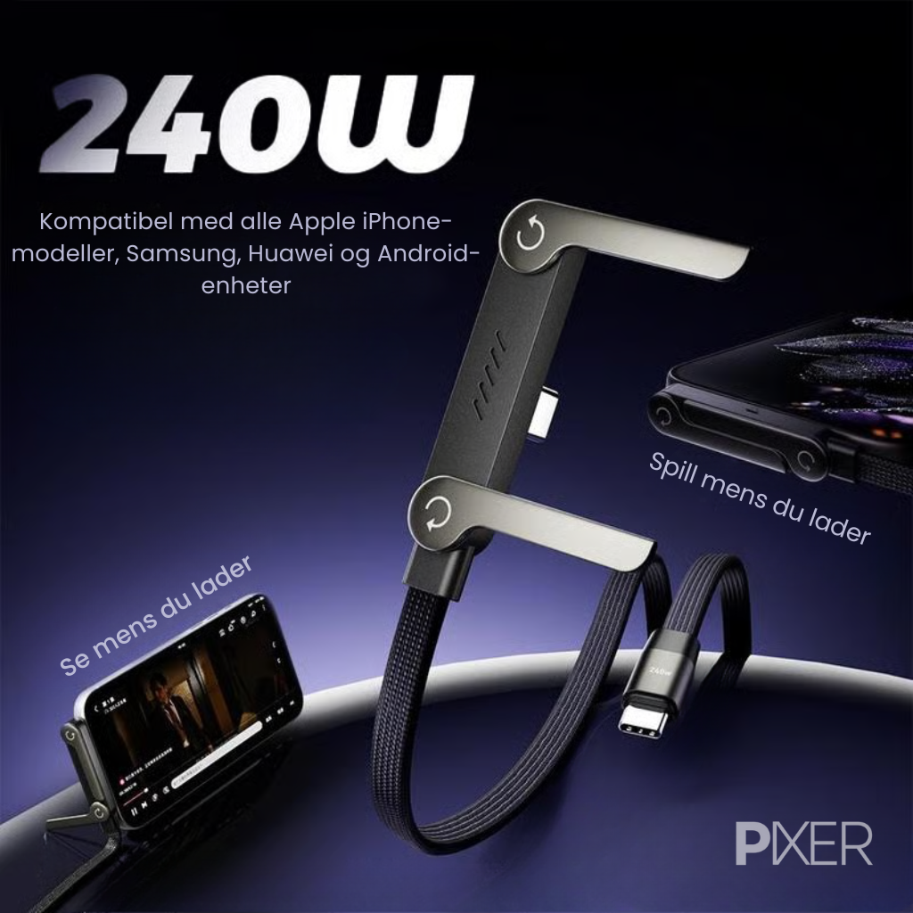 Oppgrader lade- og visningsopplevelsen med den innebygde holder-ladeledningen fra Pixer! Denne stilige 2-i-1-løsningen kombinerer en superrask 240W-ladekabel med et foldbart telefonstativ. Perfekt for gaming, arbeid eller serie-maraton, og kompatibel med iPhone, Samsung og alle Type-C-enheter. Hold skrivebordet ryddig, lad raskere, og nyt håndfri visning hvor som helst!