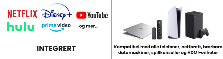 Opplev filmer, spill og mer hvor som helst — kompakt, bærbar og klar på sekunder. Ingen stor TV, ingen stress med oppsett.