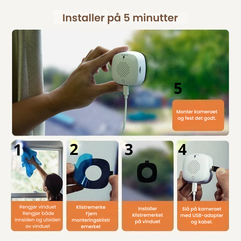 Enheten kan installeres på bare fire enkle steg, uten behov for profesjonelle verktøy eller kompliserte operasjoner. Bare dra av klistremerket for å feste den, og den er klar til bruk med USB-strømforsyning.